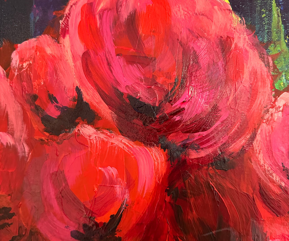 Cette œuvre vibrante dévoile un bouquet de fleurs rouge intense qui éclate de vie sur un fond profond aux nuances de bleu et de vert lumineux. La composition, riche en contrastes et en textures, évoque la passion, l’énergie et l’émerveillement d’une nuit illuminée par la beauté de la nature. Elle nous transporte dans un univers poétique où la nature s'exprime intensément, célébrant la vie même dans l'obscurité.